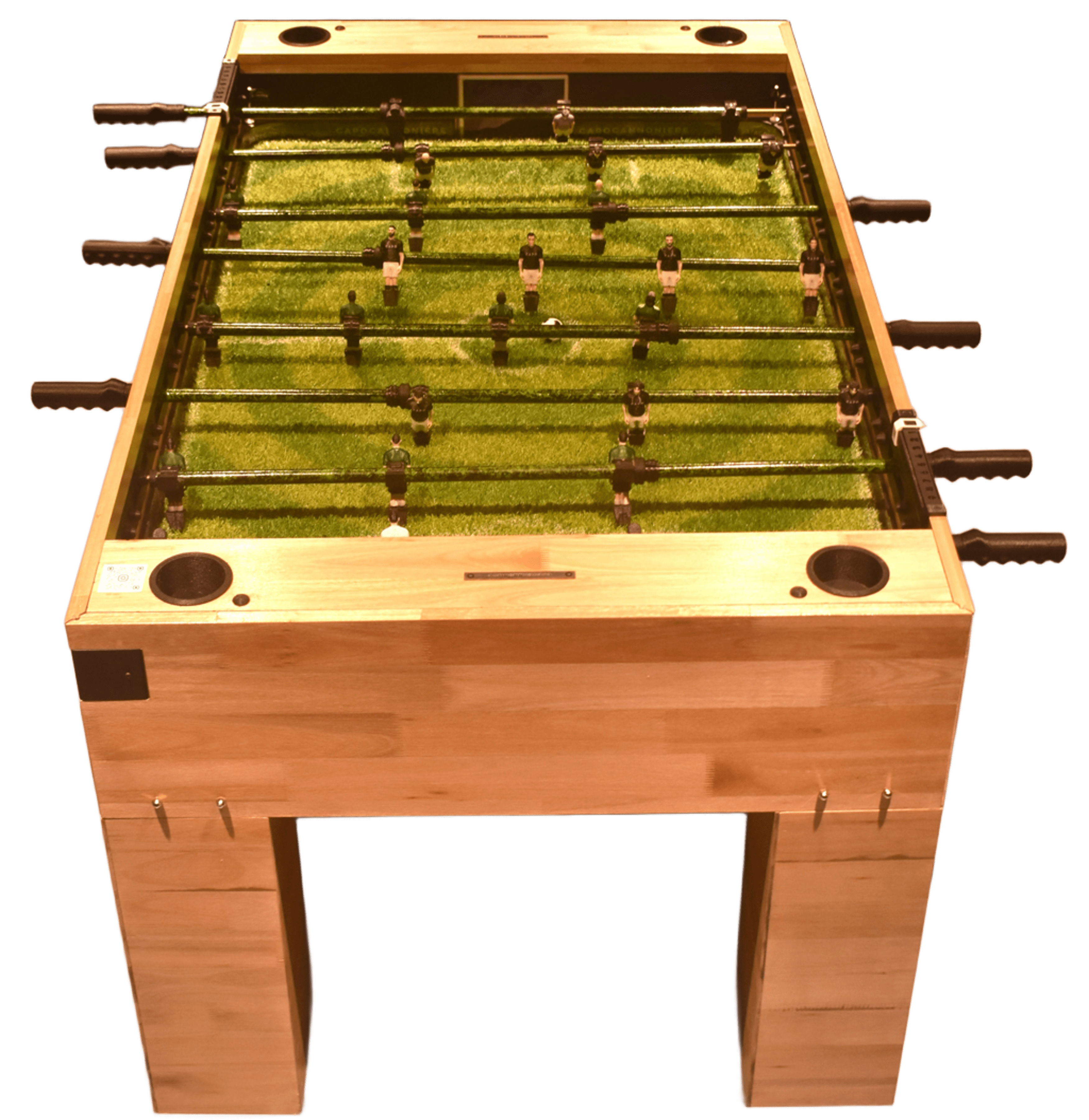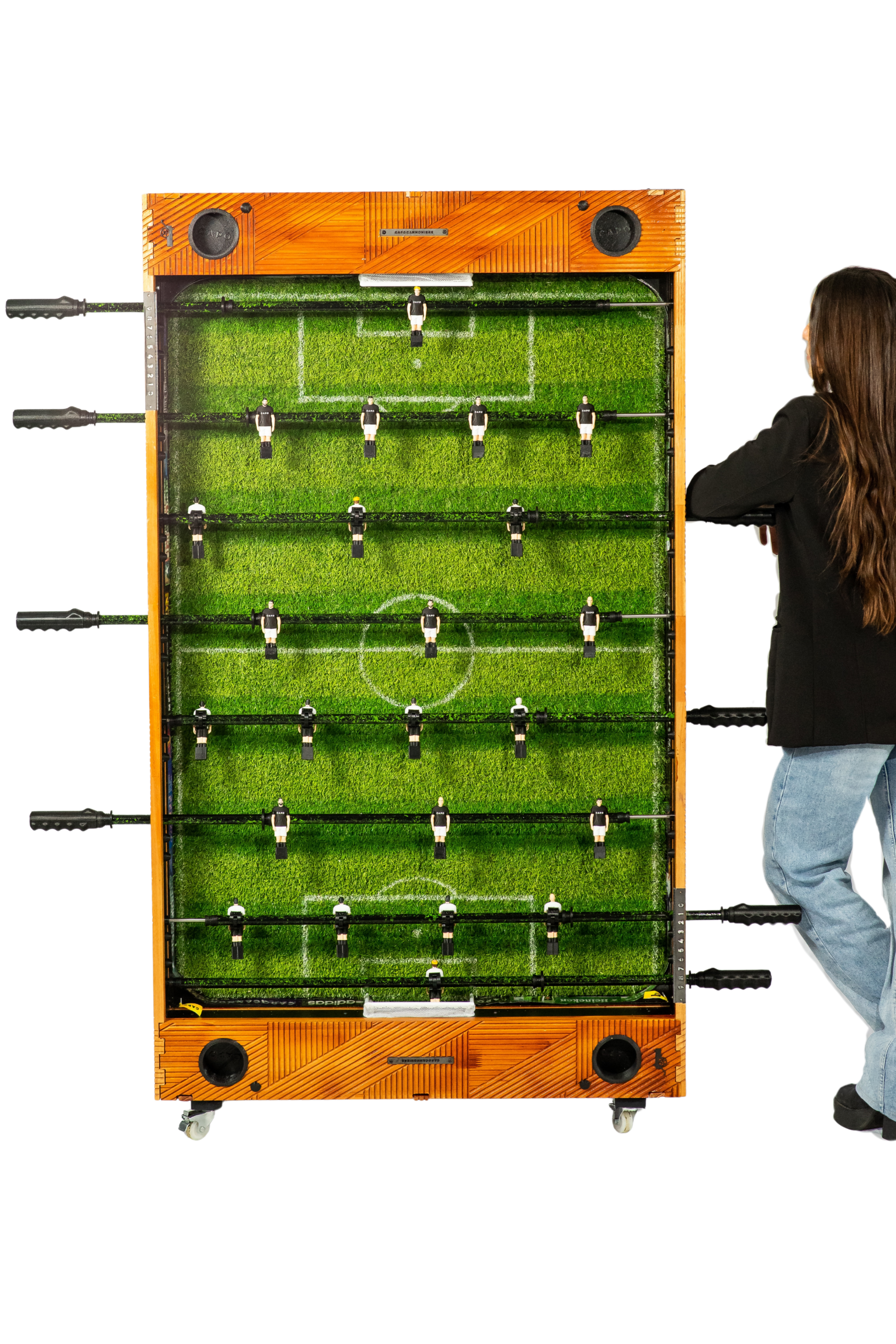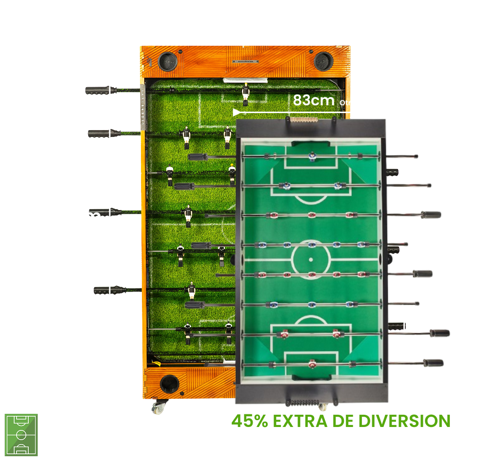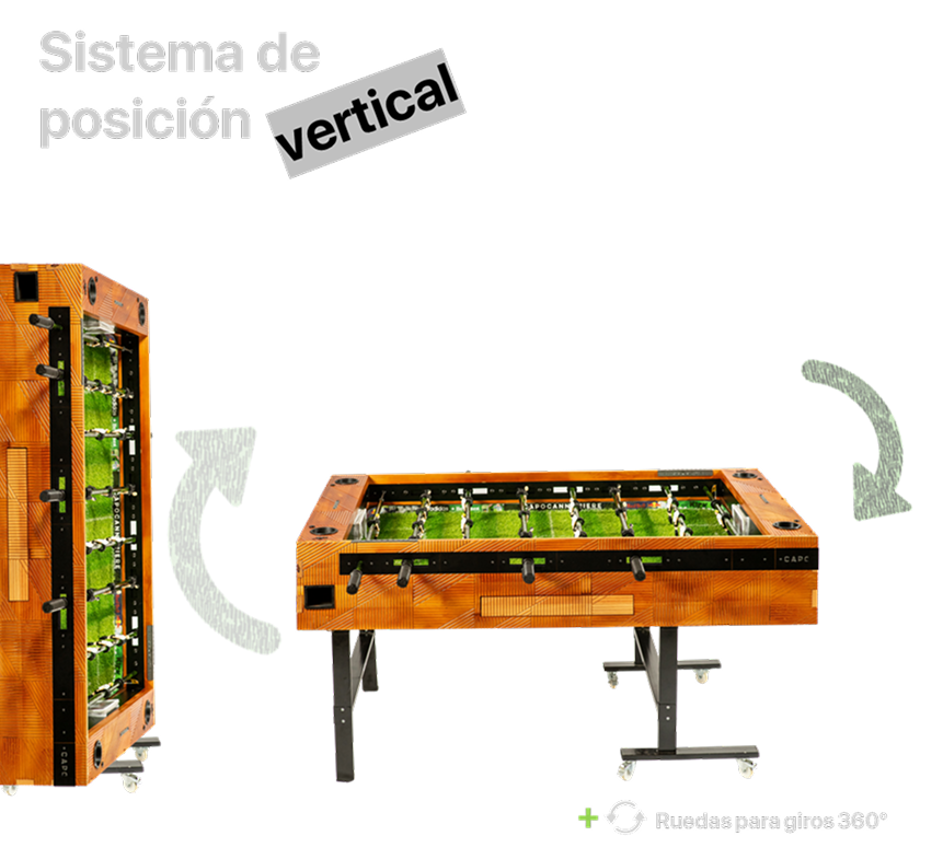 Imagina la versatilidad definitiva. Con la innovadora función retráctil de Capocannoniere, tu espacio se transforma al instante. De un vibrante epicentro de juego, tu metegol se eleva con gracia y se posiciona verticalmente, convirtiéndose en el adorno más sofisticado y funcional de tu quincho, sala de juegos o living. Ya no guardas un metegol, exhibes una obra de diseño que sorprende y deleita, liberando espacio con un toque de magia